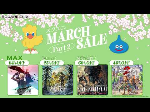 #スクエニ MARCH SALE 開催中! #squareenix #finalfantasy #ファイナルファンタジー #dragonquest #ドラクエ スクエア・エニックス 2026.03.122026.03.14 スクエア・エニックス 2026年3月11日 04:55 スクウェア・エニックス @幻影霧人 チョコダン1の配信ずっと待ってる 2026年3月11日 05:33 いいね5件 @futurenow7137 今もリベンジオブザセブンを楽しんでおります。素敵なゲームをありがとうございます。 2026年3月11日 06:02 いいね4件 @アンランジェ クセが強いんじゃ〜🤣🤣 2026年3月11日 07:43 いいね3件 @nate6045 Is this announcer guy drunk? 2026年3月11日 06:08 いいね2件 @バッドガイ-b1x スコフィィィィールドォォォォ 2026年3月12日 00:30 いいね1件 @Cruisehr_617 FINAL FANTASY 13 TRILOGY REMASTERED 2026年3月11日 13:06 いいね1件 @いか-b8u これドラクエ6リマスターで若本規夫さんにダークドレアムの声収録するついでに宣伝頼んだとかかな?(邪推) 2026年3月11日 08:21 いいね1件 @willkeiichi ※Switch 版のFFXII、Switch 2でプレイすると進行に影響のあるバグがあるようでのSwitch 2では購入不可状態。 2026年3月11日 07:33 いいね1件 @Tanner_Strife Anyone got the name of the music. 2026年3月12日 01:19 いいね0件 @DH8025 What’s the 3rd game? 2026年3月11日 12:18 いいね0件